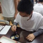 1日目は、石川県観光物産館で伝統工芸の金箔貼り体験をし、自分で選んだデザインの金箔をお皿に慎重に貼り付けました。昼食後、石川県立美術館で、九谷焼や輪島塗等の石川県の工芸品や、歌川広重等の華やかな絵画を見学しました。