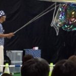 大道芸人のシャボンさんによるしゃぼん玉ショーでは、色とりどりのしゃぼん玉に触ったり、大量のしゃぼん玉を追いかけたりして楽しみ、ショーの後は巨大なシャボン玉の中に入っての撮影会を行いました。